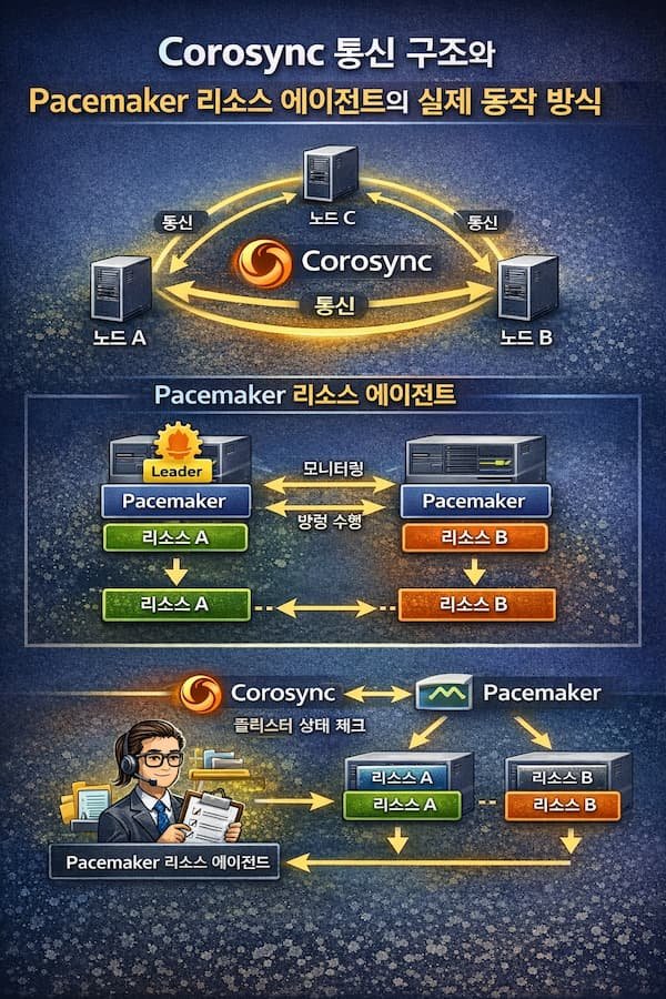 이 글에서는 Corosync의 통신 구조와 Pacemaker 리소스 에이전트가 실제로 어떻게 동작하는지를 내부 흐름 기준으로 심층 분석한다.